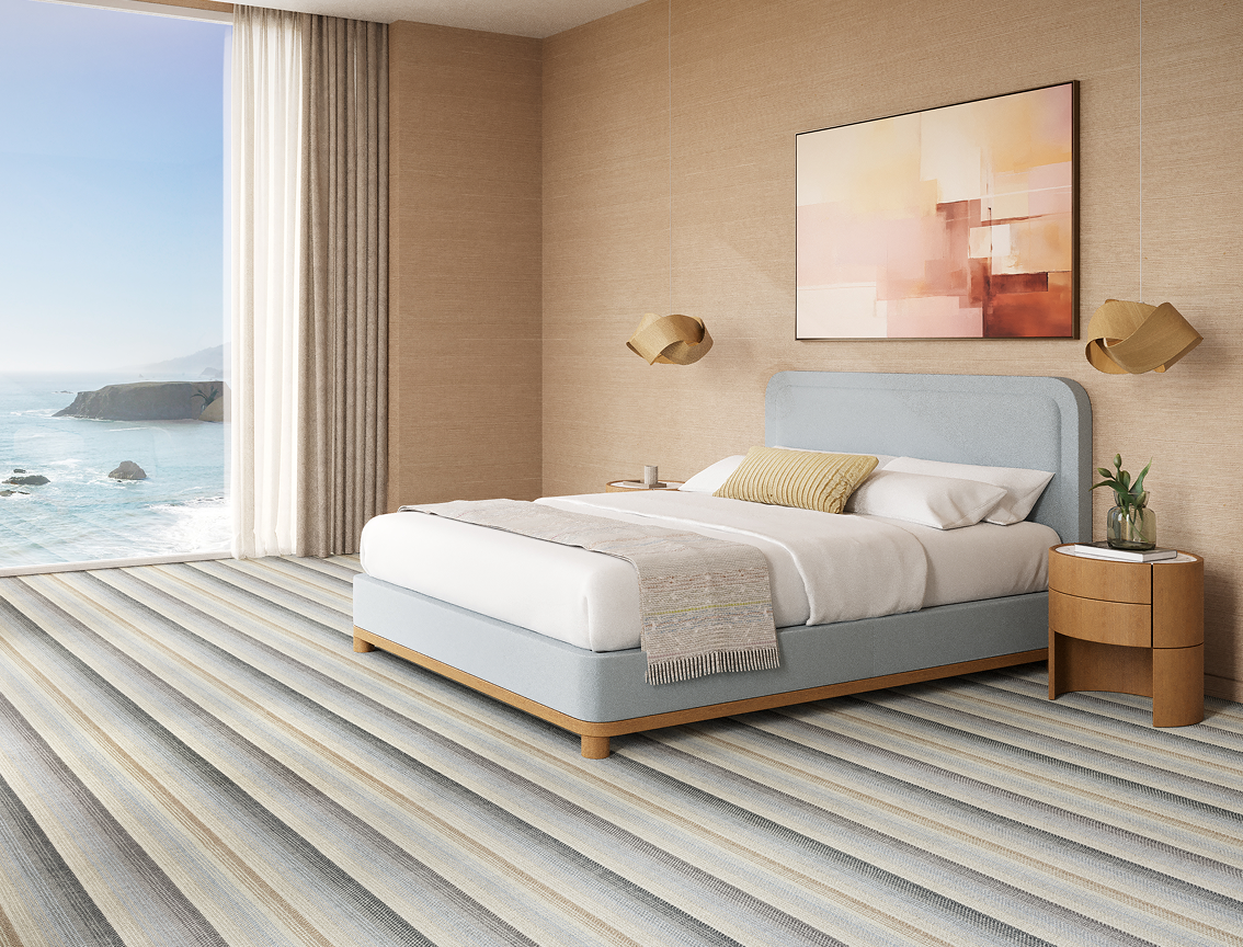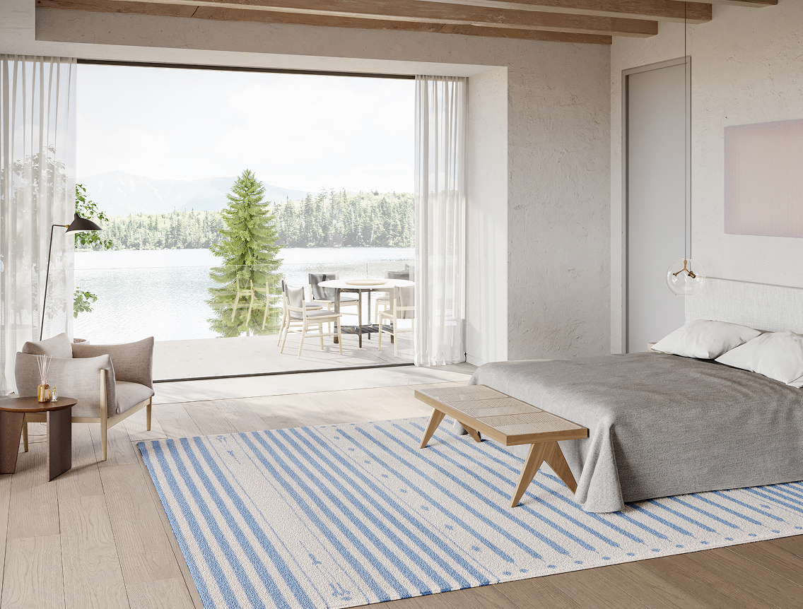 Rugs add warmth to the bedroom and should center around the bed. For a queen or king, aim for 18–24" of rug beyond the sides and foot. It frames the bed, prevents tripping, and gives a soft landing. Here are two layout ideas: