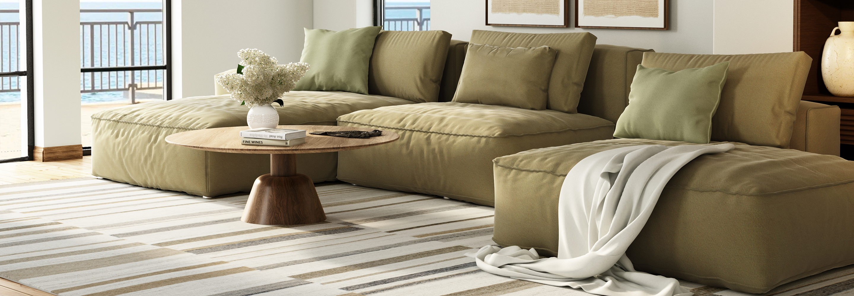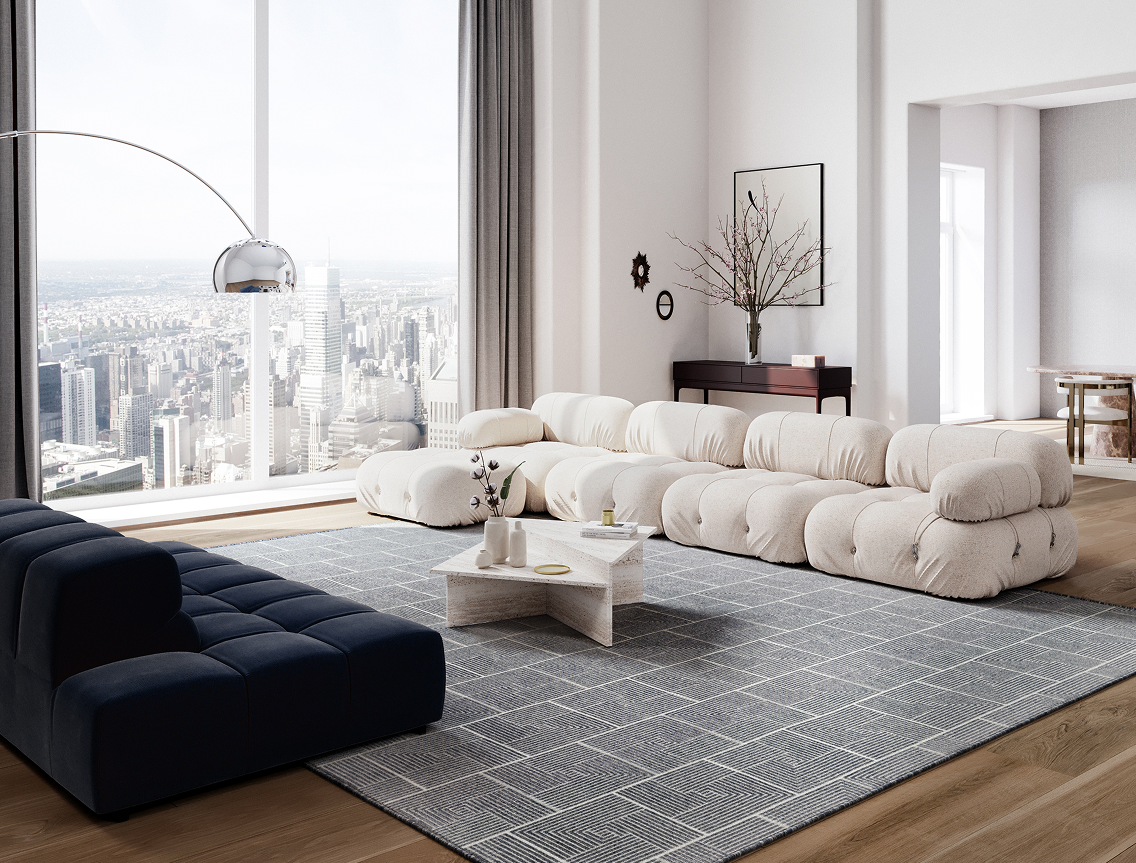 Only the front legs of sofas and chairs rest on the rug—perfect for smaller rooms or furniture against walls. Choose a rug big enough for the front legs of main pieces, with space around the edges to keep things airy and balanced.